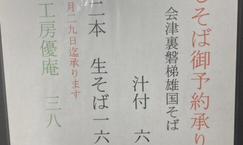 ラーメン・そば・うどんお知らせ 年越しそば ご予約承ります 会津裏磐梯雄国産そば 生そば(汁付) 690円 海老天2本付生そば(汁付) 1670円 12月29日までご予約承ります。 ご予約 0465-38-3811 蕎麦工房 優庵 歳末感謝…
