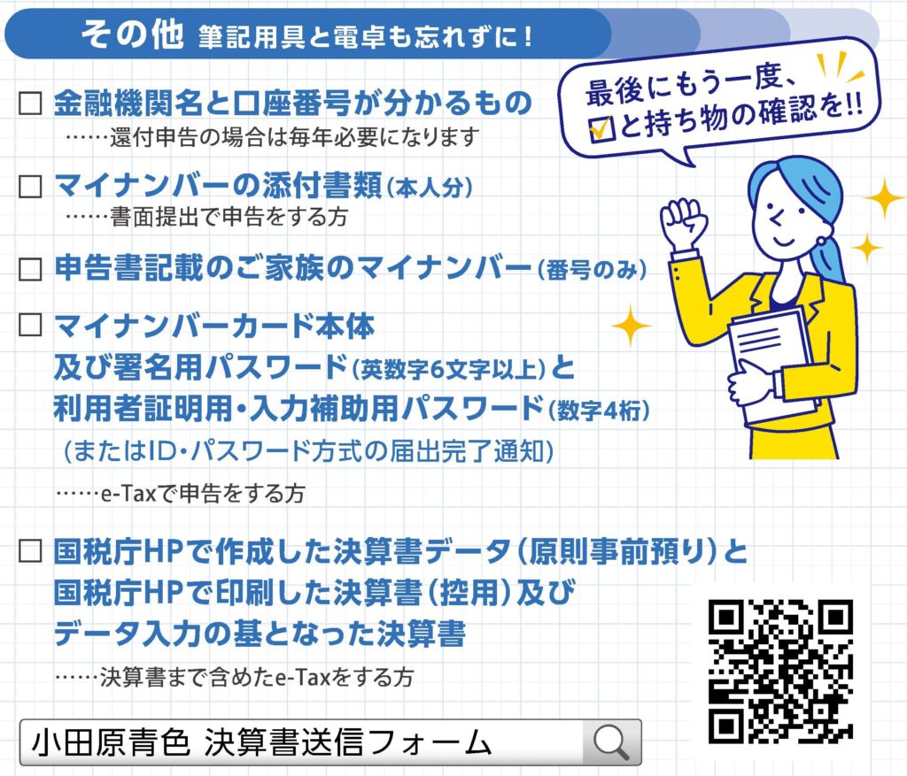 □ 金融機関名と口座番号が分かるもの…還付申告の場合には毎年必要になります