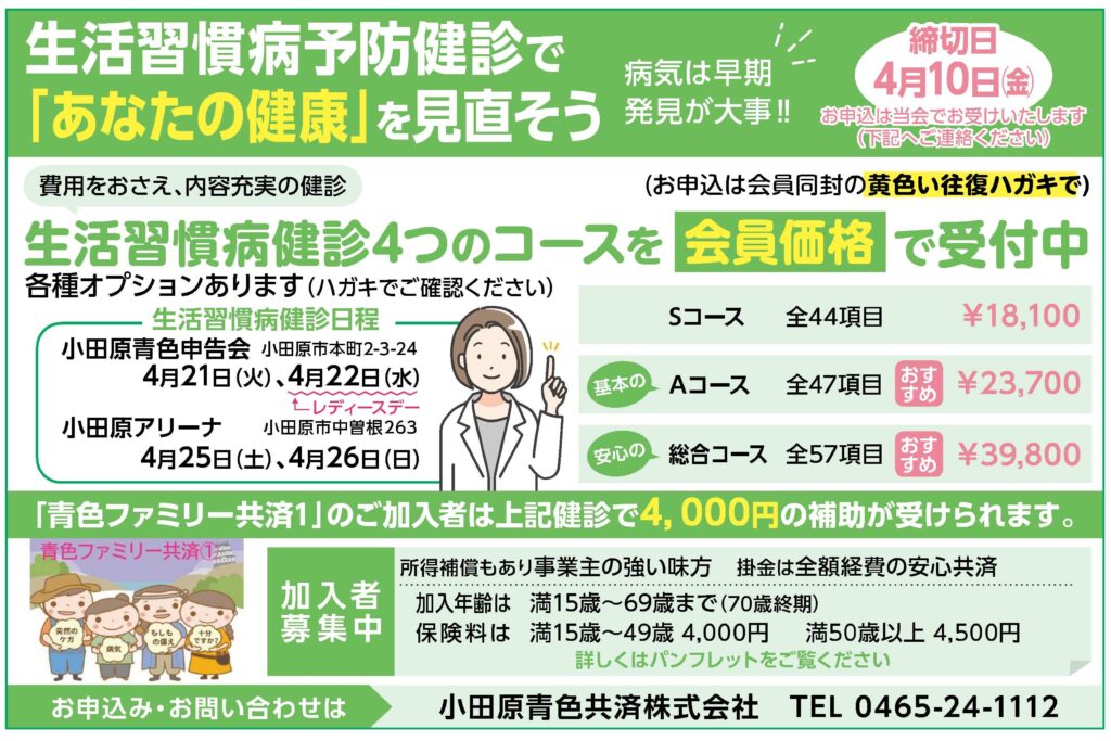 トップページお知らせ当会からのお知らせ生活習慣病予防健診のご案内 申込締切4月10日