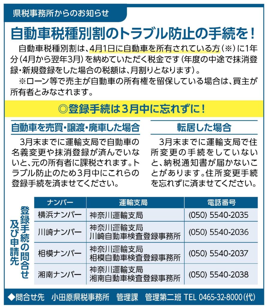 月末までに運輸支局で自動車の名義変更や抹消登録が済んでいないと、元の所有者に課税されます。トラブル防止のため3月中にこれらの登録手続を済ませてください。