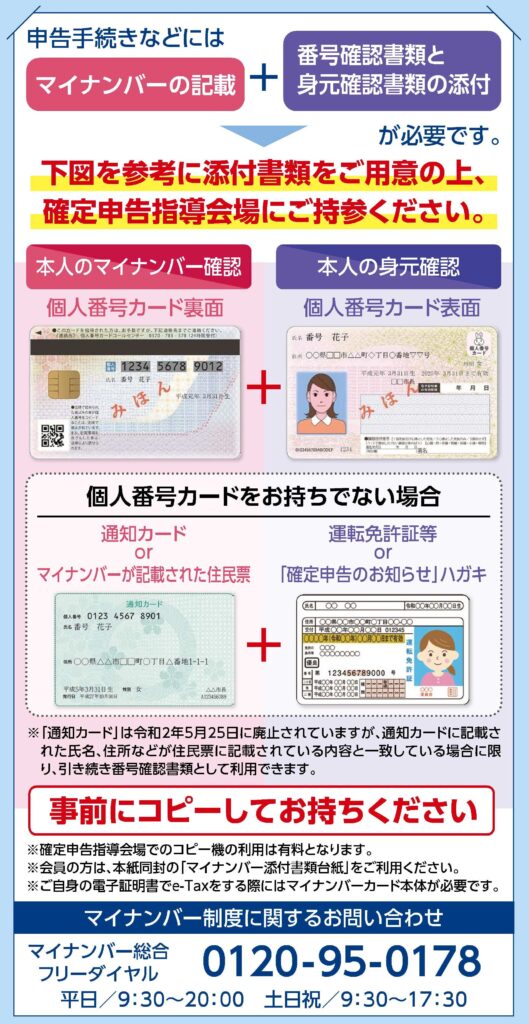 申告手続きなどには『マイナンバーの記載』+『番号確認書類と身元確認書類の添付』が必要です。