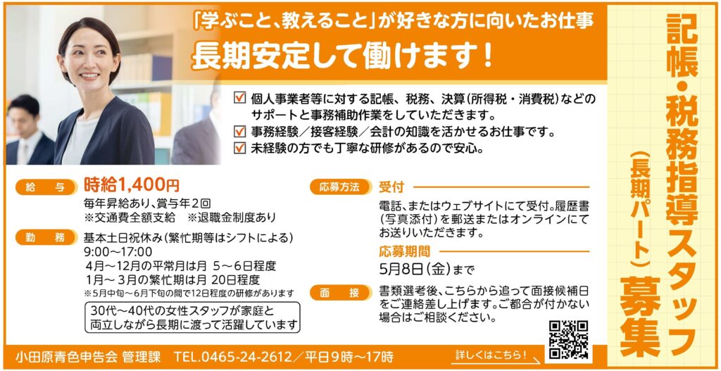 記帳・税務指導スタッフ(長期パート)募集