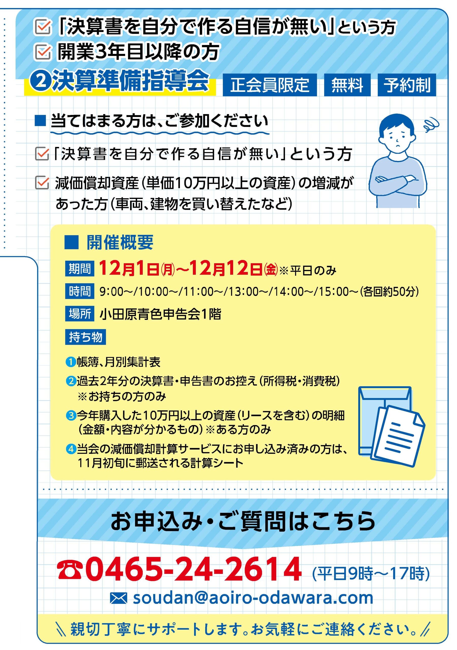 トップページセミナーのご案内記帳指導決算準備指導会 12/1~12/25 決算書作成が不安な方へ【会員限定】【予約制】kessan_202510